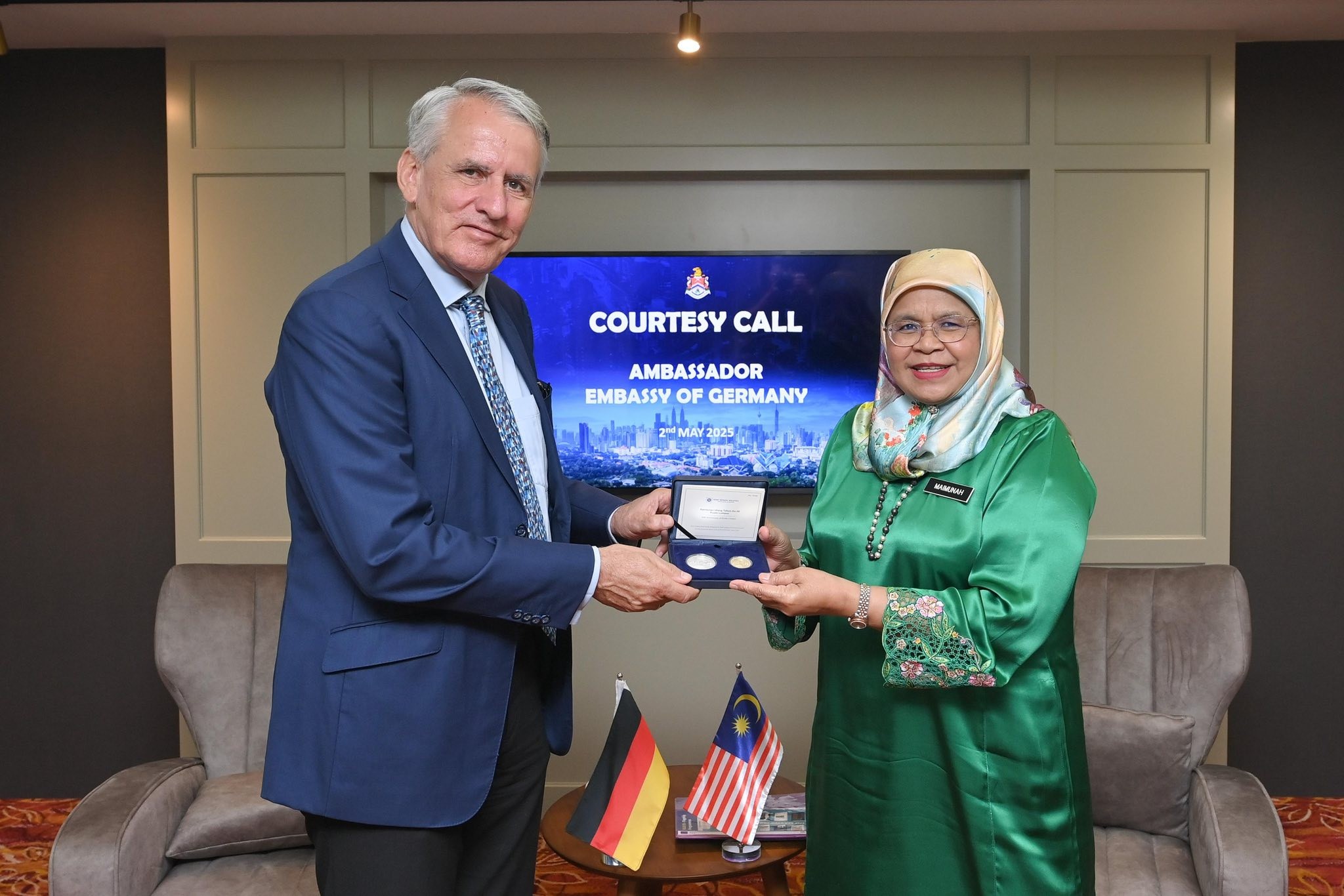 YBhg. Dato’ Seri TPr (Dr.) Maimunah binti Mohd Sharif, Datuk Bandar Kuala Lumpur pada 2 Mei 2025 telah menerima kunjungan hormat daripada TYT Dr. Peter Blomeyer, Duta Besar Republik Jerman di Malaysia bertempat di Tingkat 28, Menara DBKL 1.