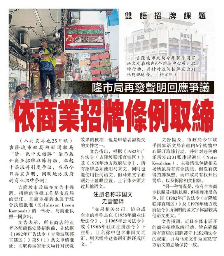 DBKL Issued Another Statement In Response To The Controversy Banning It According To The Commercial Signs Ordinance – Sin Chew Daily