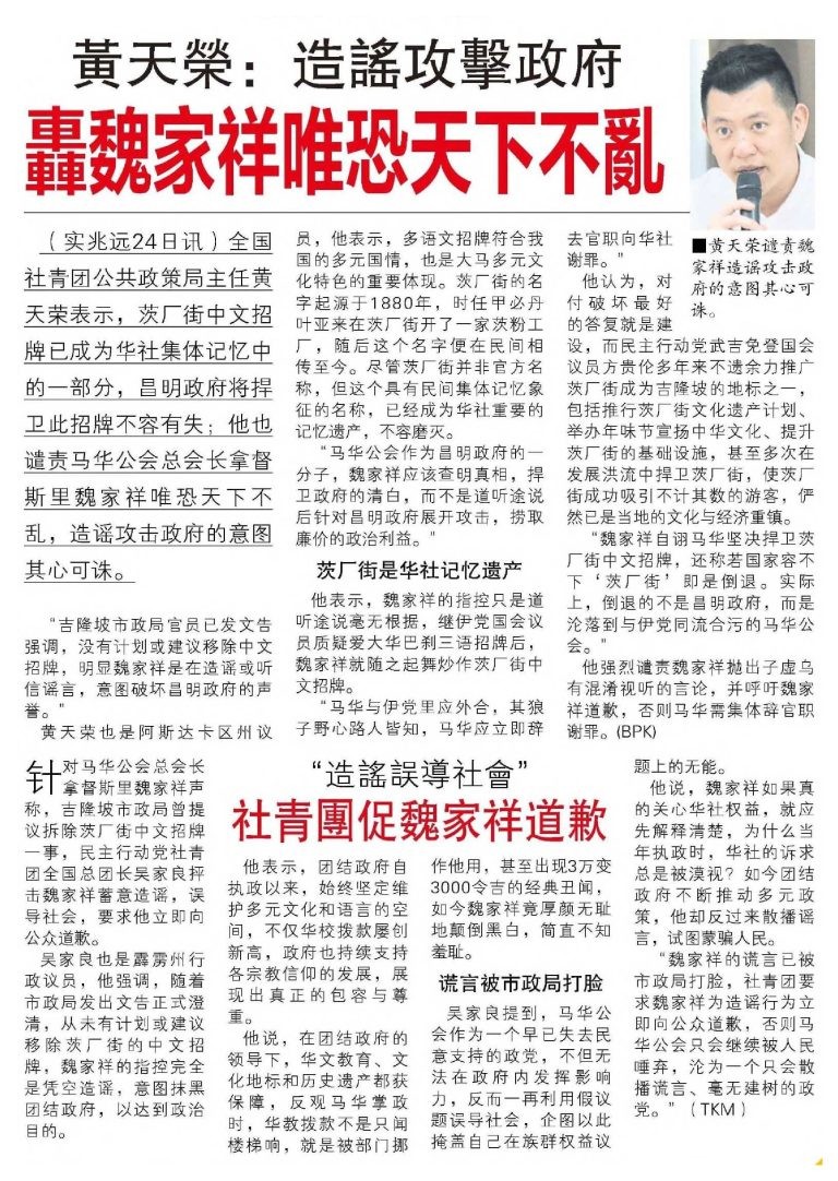 Huang Tianrong: Spreading Rumors To Attack The Government;Criticizing Wee For Wanting The World To Be In Chaos - Guang Ming Daily