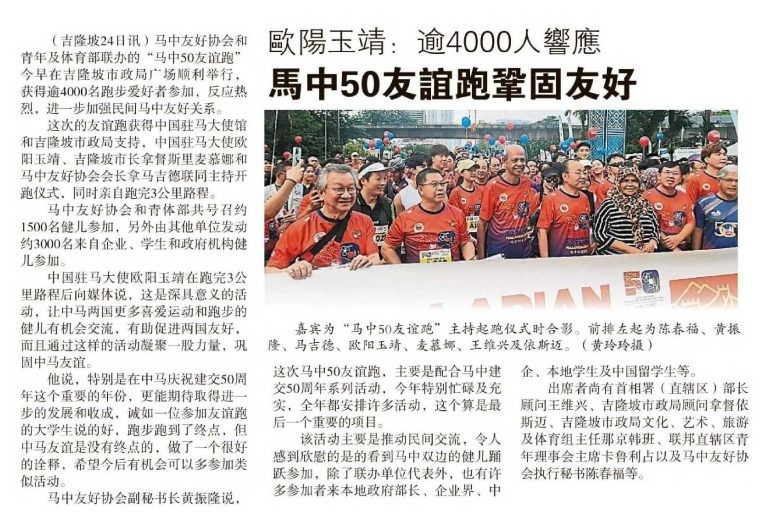 Ouyang Yujing: More than 4 000 people responded;Malaysia-China 50th Friendship Run Consolidates Friendship – Sin Chew Daily
