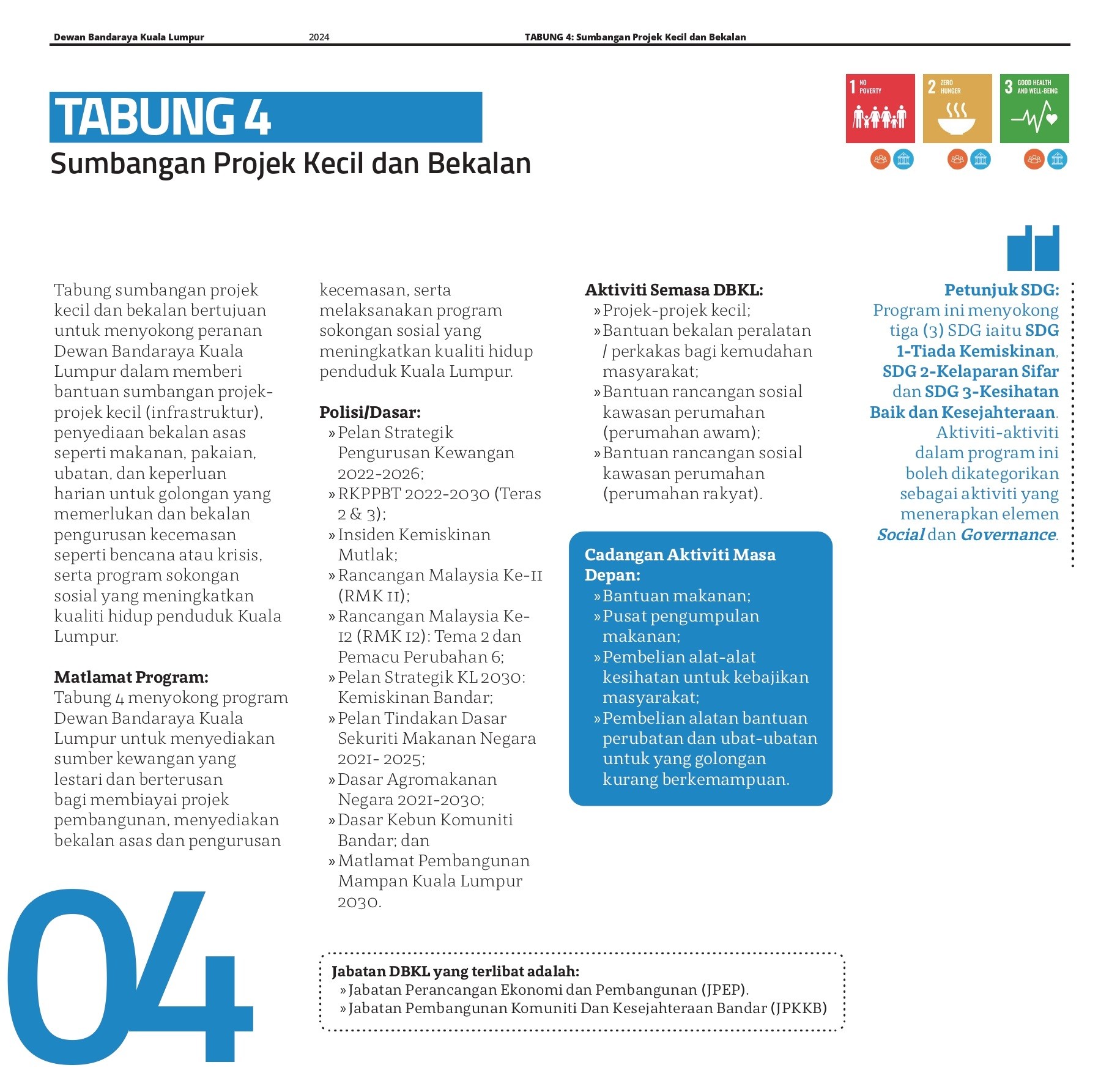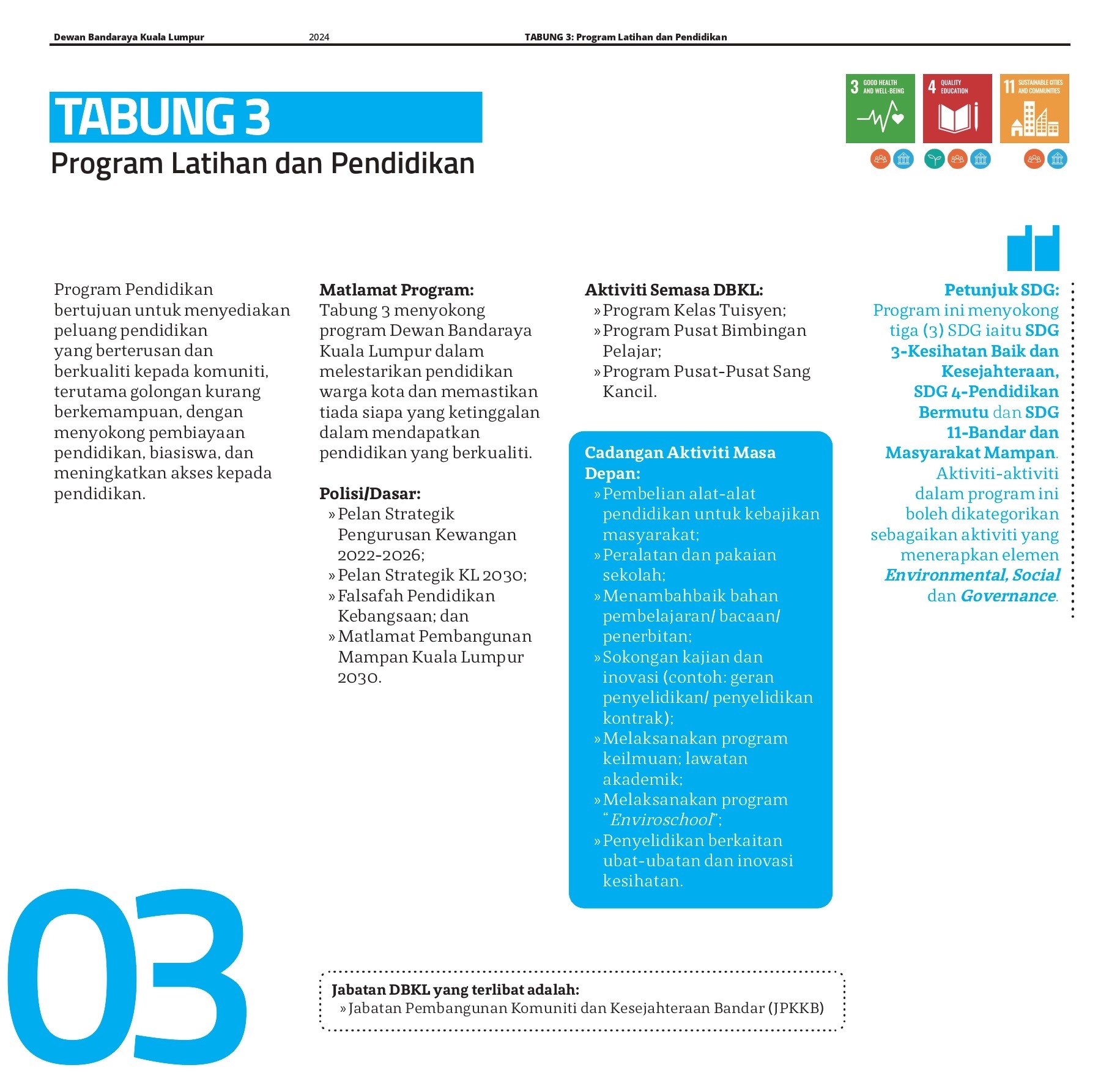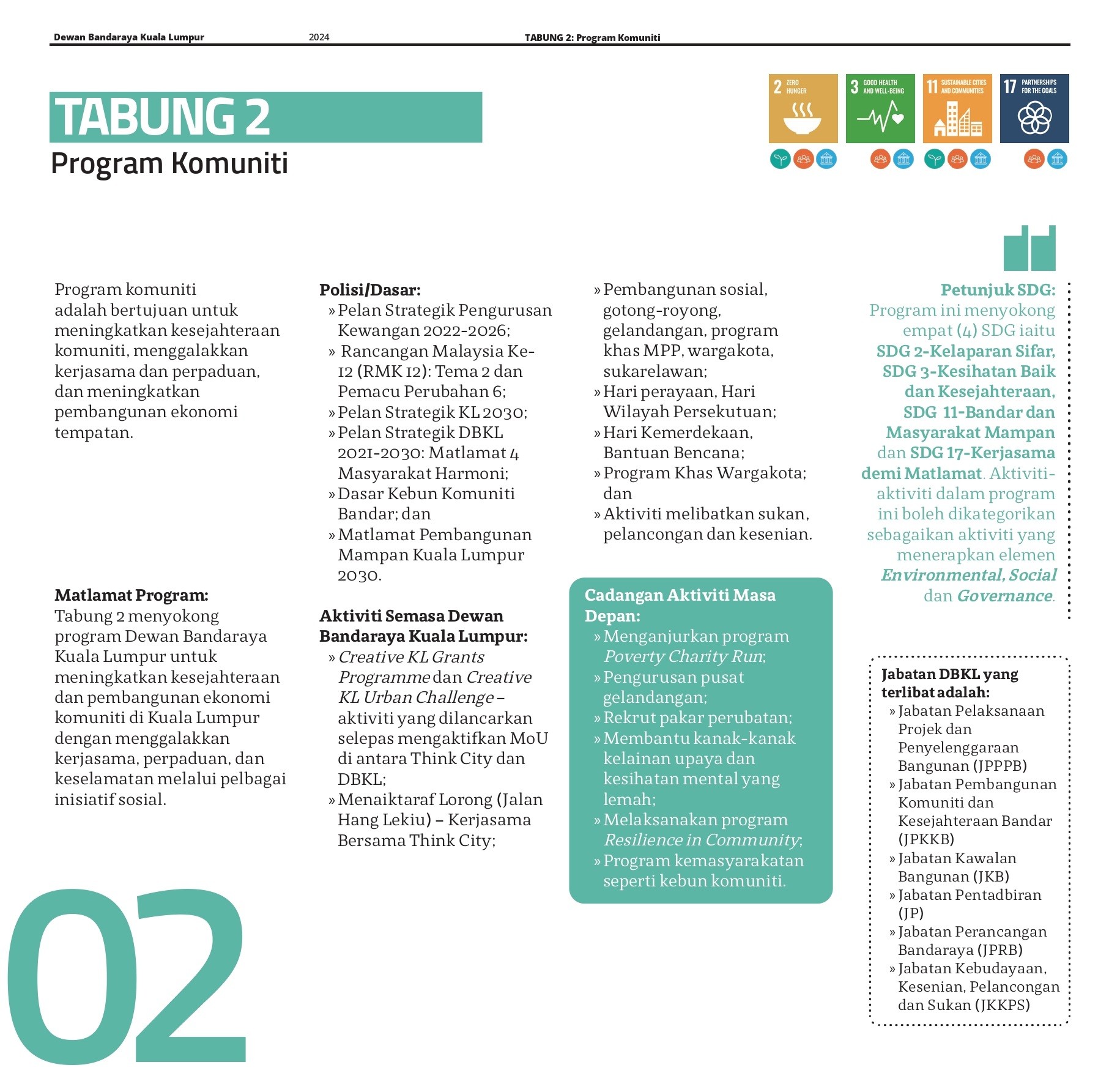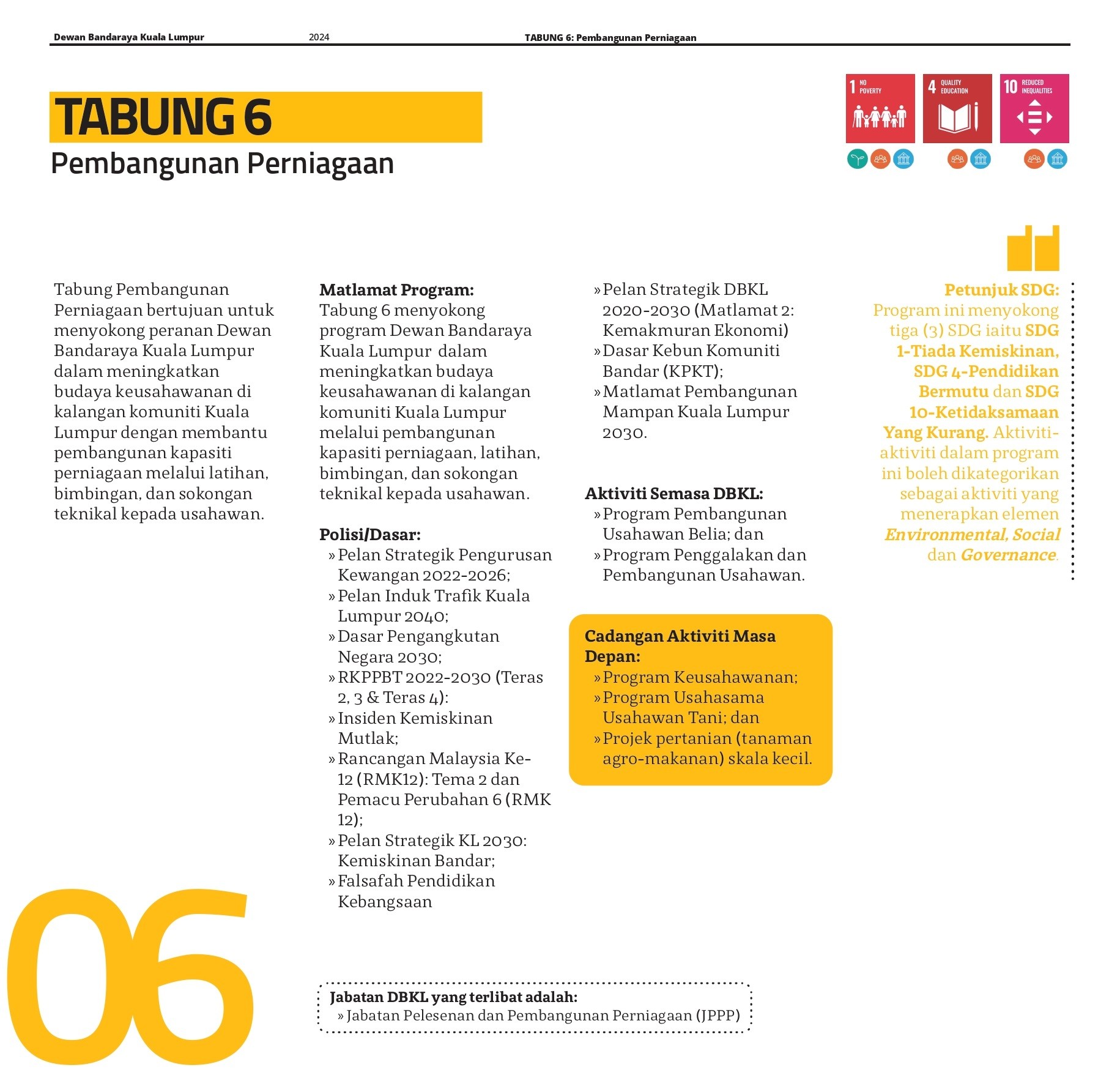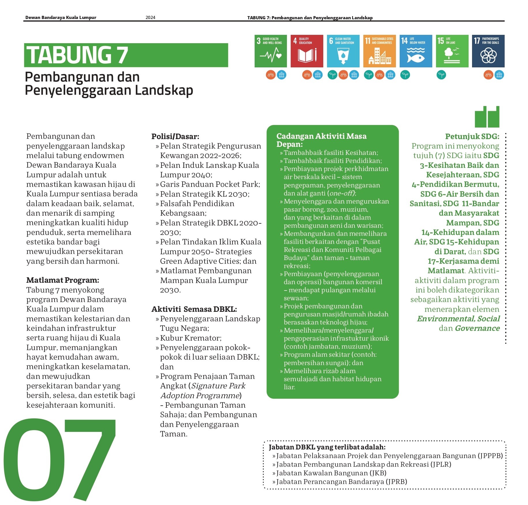 Pengurusan tabung endowmen ini selari dengan prinsip ESG (Environmental, Social, and Governance), yang menjadi panduan penting dalam pengurusan organisasi moden. Dalam konteks Tabung Endowmen Dewan Bandaraya Kuala Lumpur, pelaksanaan ESG memastikan bahawa setiap inisiatif dan perbelanjaan mematuhi prinsip tanggungjawab sosial dan kelestarian alam sekitar, serta diurus dengan tata kelola yang telus dan berintegriti. Visi ini juga selaras dengan matlamat SDG (Sustainable Development Goals), di mana aspek kebersihan, kesihatan, kemajuan teknologi, keselamatan, dan kelestarian alam sekitar menjadi komponen utama dalam perancangan dan pelaksanaan pembangunan bandar. Ini memastikan bahawa Wilayah Persekutuan bukan sahaja memenuhi keperluan semasa tetapi juga menjamin kemajuan lestari untuk generasi akan datang.